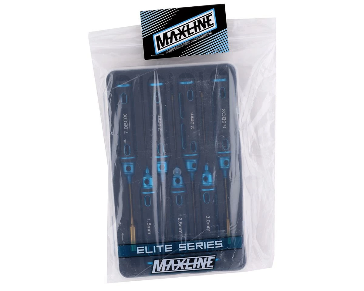The Maxline Elite Series Essentials Wrenches feature an ergonomic handles and precision ground tips to offer the best in comfort & fit while wrenching on your R/C cars. Featuring a 1.5, 2.0, 2.0 ball, 2.5 and 3.0mm hex wrench with a 5.5 and 7.0mm nut driver. This tool set will get you the most commonly used wrenches found on 1/10 cars and trucks. Package includes one essential wrench set.