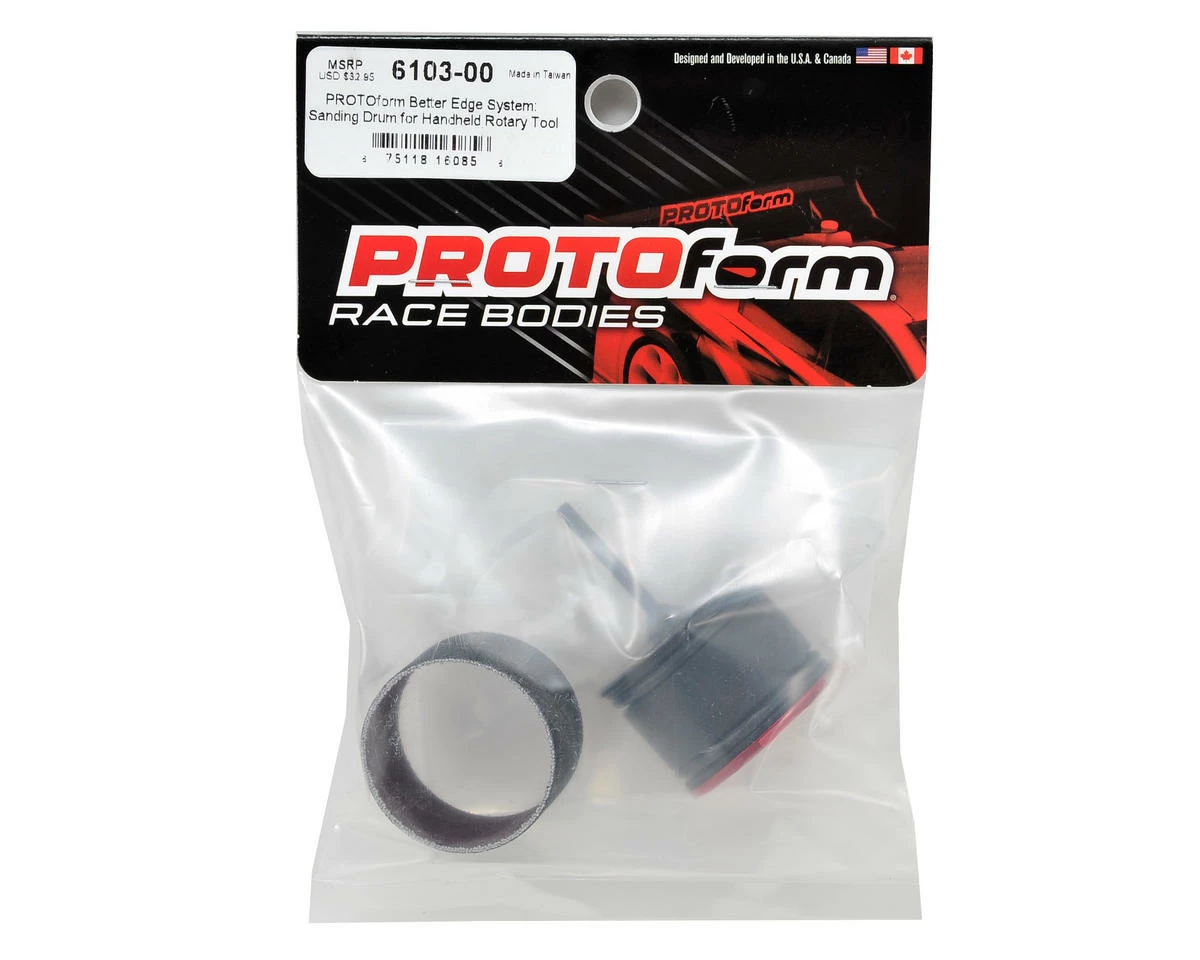 The drum’s red and black anodized aluminum finish and laser-etched PROTOform logos give it a trick look on your pit table. Each pre-assembled kit comes with a replaceable high-grade 120-grit silicon carbide spiral sanding band, rubber anti-slip o-rings and a mandrel made from durable tool steel to prevent damage from your rotary tool’s chuck.