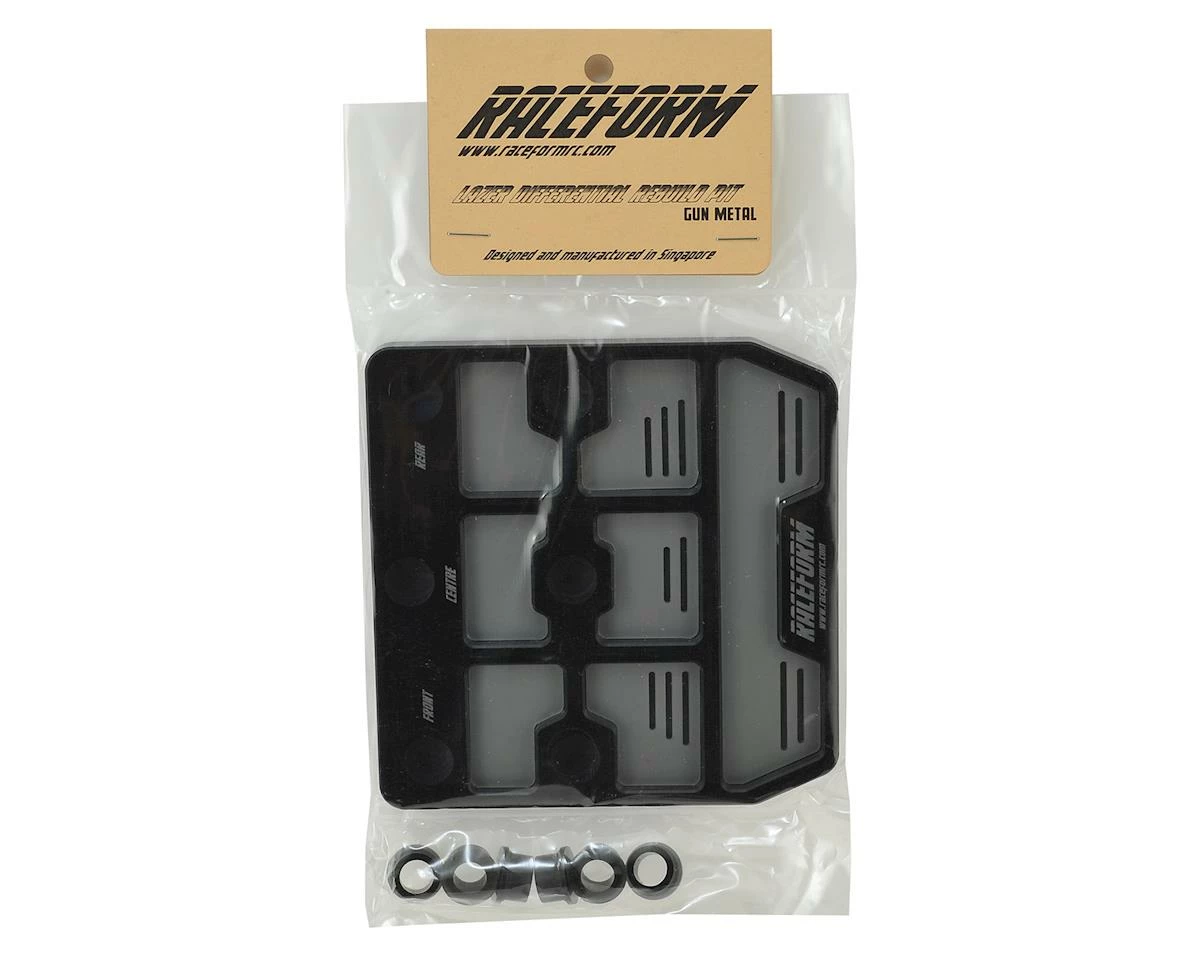 The Raceform Lazer Differential Rebuild Pit is designed to make 1/10 and 1/8 scale diff maintenance easier. The design allows compatibility with all cars, and the compartments inside the tray have milled slots to hold shims and o-rings, making them easier to grab from the tray. Â