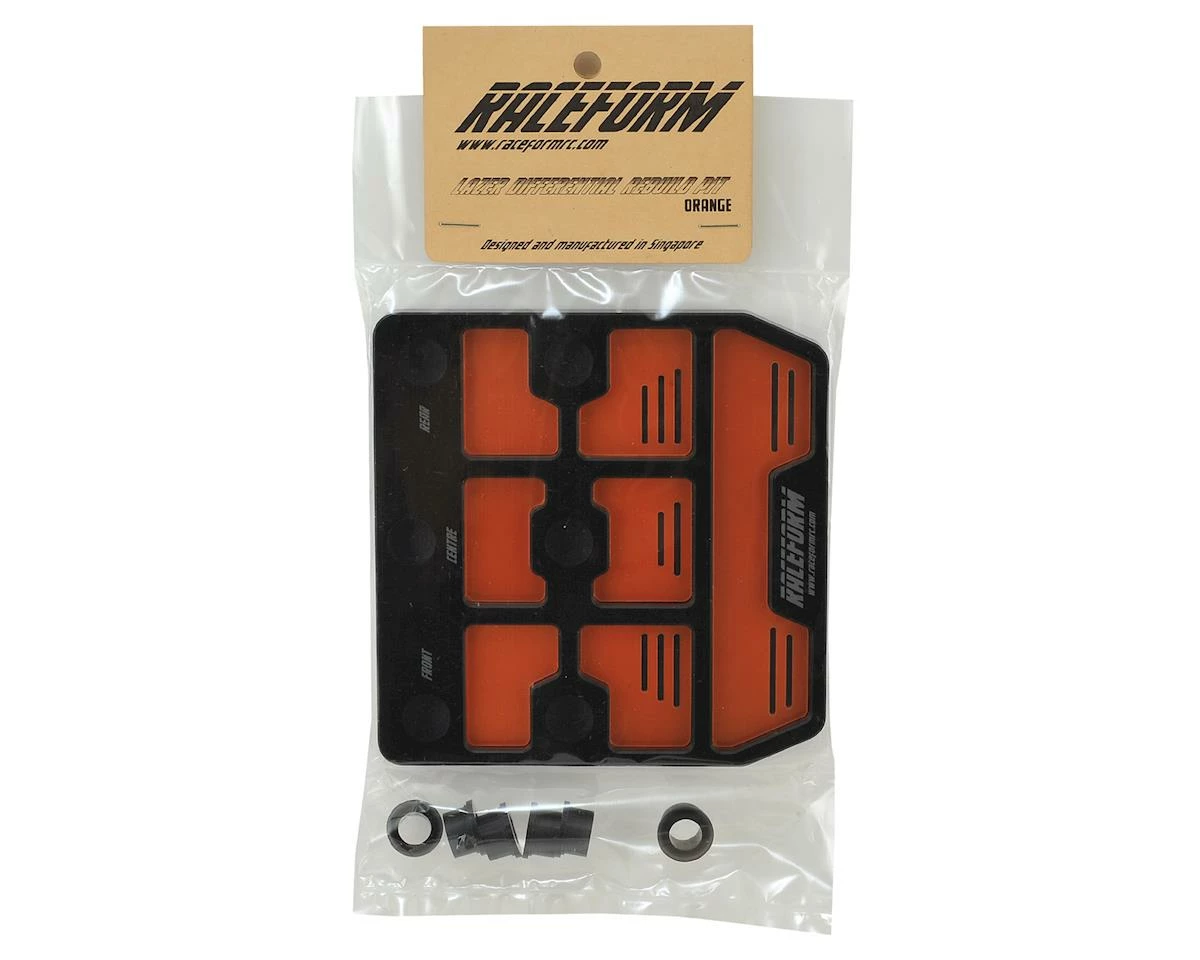 The Raceform Lazer Differential Rebuild Pit is designed to make 1/10 and 1/8 scale diff maintenance easier. The design allows compatibility with all cars, and the compartments inside the tray have milled slots to hold shims and o-rings, making them easier to grab from the tray.