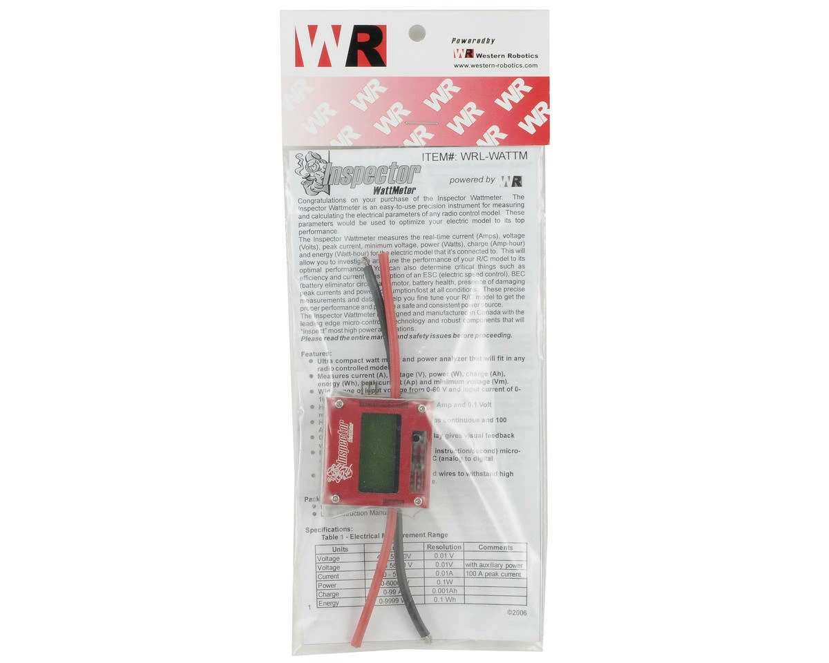 This is the Western Robotics Inspector WattMeter. The Inspector WattMeter is an easy-to-use precision instrument for measuring and calculating the electrical parameter of any radio control model. These parameters would be used to optimize your electric model to its top performance. The Inspector WattMeter measures real-time current, voltage, peak current, minimum voltage, power, charge and energy for the electric model that it’s connected to. This will allow you to investigate and tune the performance of your R/C model to its optimal performance. You can also determine critical things such as efficiency, and current consumption of an ESC, BEC and motor, power consumption/lost at all conditions. These precise measurements and data will help you fine tune your R/C model to get the proper performance and provide a safe and consistent power source. The WattMeter is also ideal for tracking the current and power consumption during the charging / discharging of any rechargeable batteries in series with a battery charger. The Inspector WattMeter is designed and manufactured in Canada with the leading edge micro-controller technology and robust components that will “inspect” most high power applications.